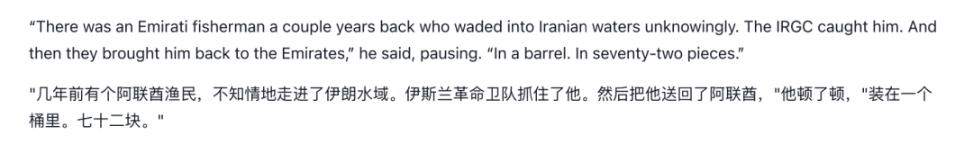 几年前有个误入伊朗水域的阿联酋渔民,被分成了72块装在桶里“遣返”回了阿联酋。