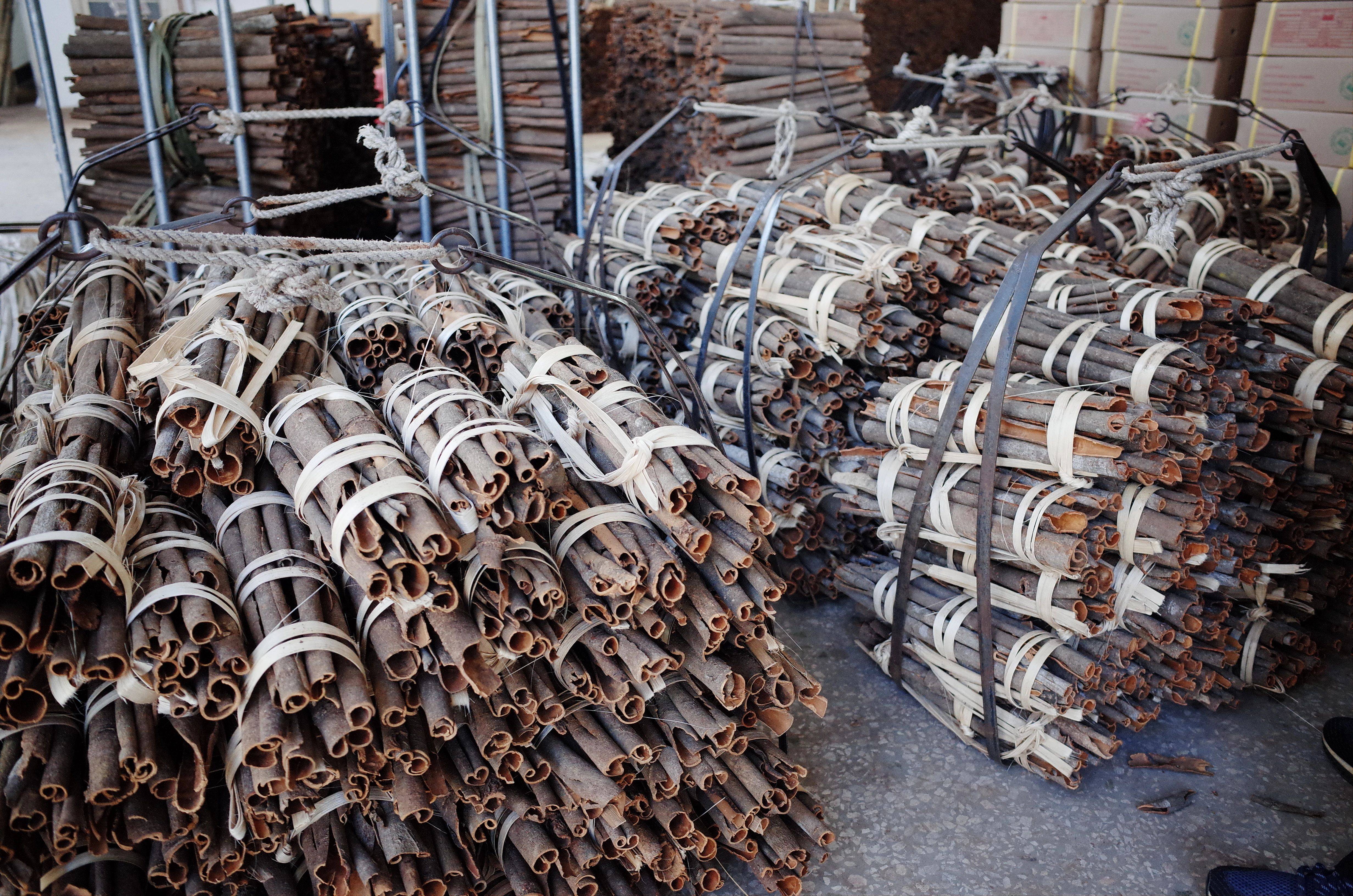 当地还有肉桂加工厂,深加工车间为提炼出肉桂天然苯甲醛这特色产品,还有提纯设备,能将桂油提炼出桂醛、苯甲醛。厂里堆放着大批包装好的产品,包装箱上印着中东文字,这意味着这些肉桂产品即将飘洋过海。