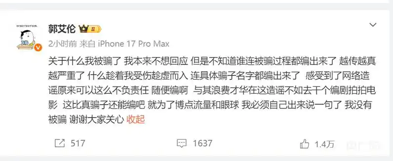 事件在不久后迎来了大反转。在4月7日午间,郭艾伦及其工作室针对此事在微博进行了辟谣。本人表示网传的被骗过程是网络造谣而非真实经历,核心只是为了博流量。“我没有被骗谢谢大家关心。”郭艾伦在微博上感谢了球迷们的关心,并直言需要追究爆料媒体的责任。