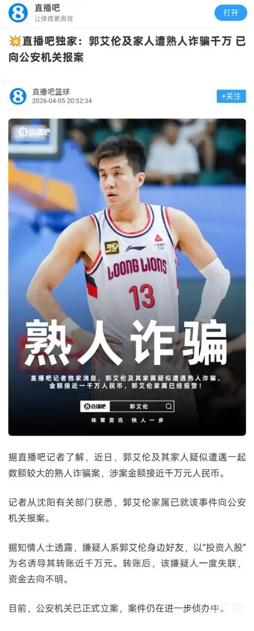在清明假期的最后一日,“郭艾伦被诈骗近千万”的消息登上了微博的热搜榜首位。根据直播吧和第一财经等多家媒体报道,郭艾伦被身边好友以“投资入股”为名诱导其转账近千万元。在郭艾伦转账后,该嫌疑人便失联,资金去向不明,郭艾伦家属随后报案。