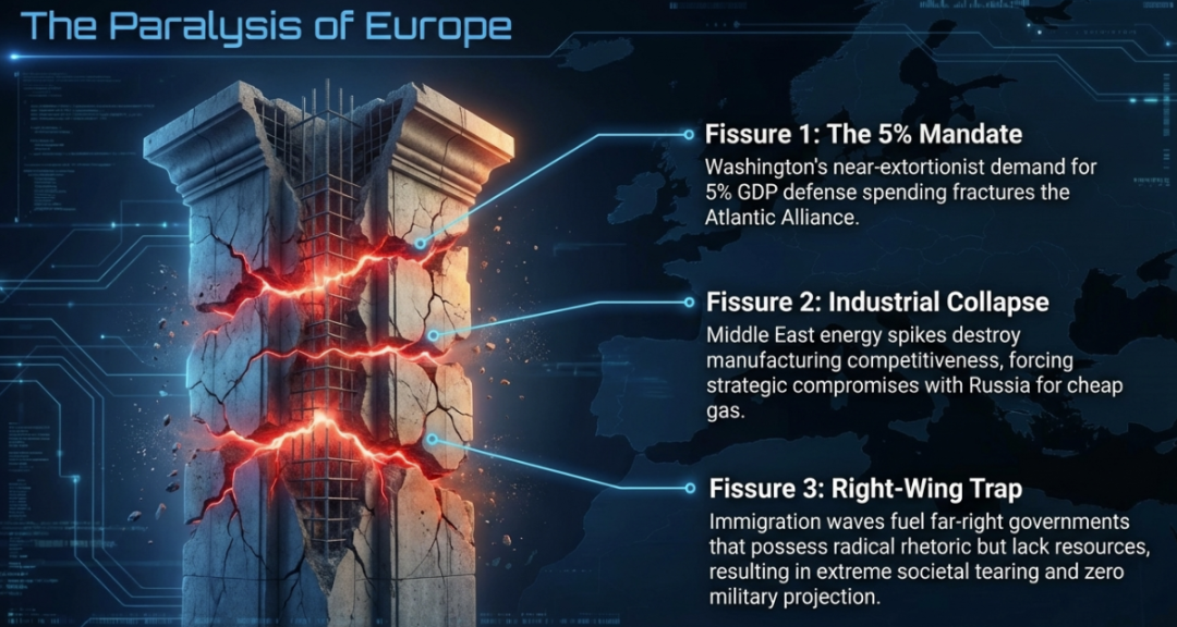 与此同时,欧洲大陆经历了一场缓慢而痛苦的断裂。华盛顿提出的5%GDP国防支出要求,成为了压垮大西洋同盟的最后一根稻草。欧洲各国既无法忍受这一近乎勒索的开支,又由于长期的去工业化和官僚监管,失去了在短时间内重建国防工业的决心。受中东冲突引发的能源暴涨冲击,欧洲的制造业竞争力接近崩塌,德国等工业核心区被迫与俄罗斯进行全方位的战略妥协,以换取维系民生的廉价天然气。