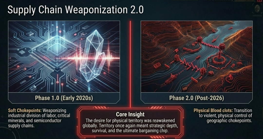 2026年后的那十年被后世史学家称为咽喉地理的大觉醒时代。这种全球供应链的血栓化迹象,其实早在2020年代初的全球大流行和稀土贸易战中就已萌芽。当时的全球大国已经意识到,基于工业分工的软咽喉,比如关键矿产和半导体供应链,可以作为致命的政治博弈工具。然而,2026年的中东冲突将这一逻辑推向了最原始、最暴力的物理阶段:从对某种资源的垄断,演变为对全球物理连接权的殊死搏斗。