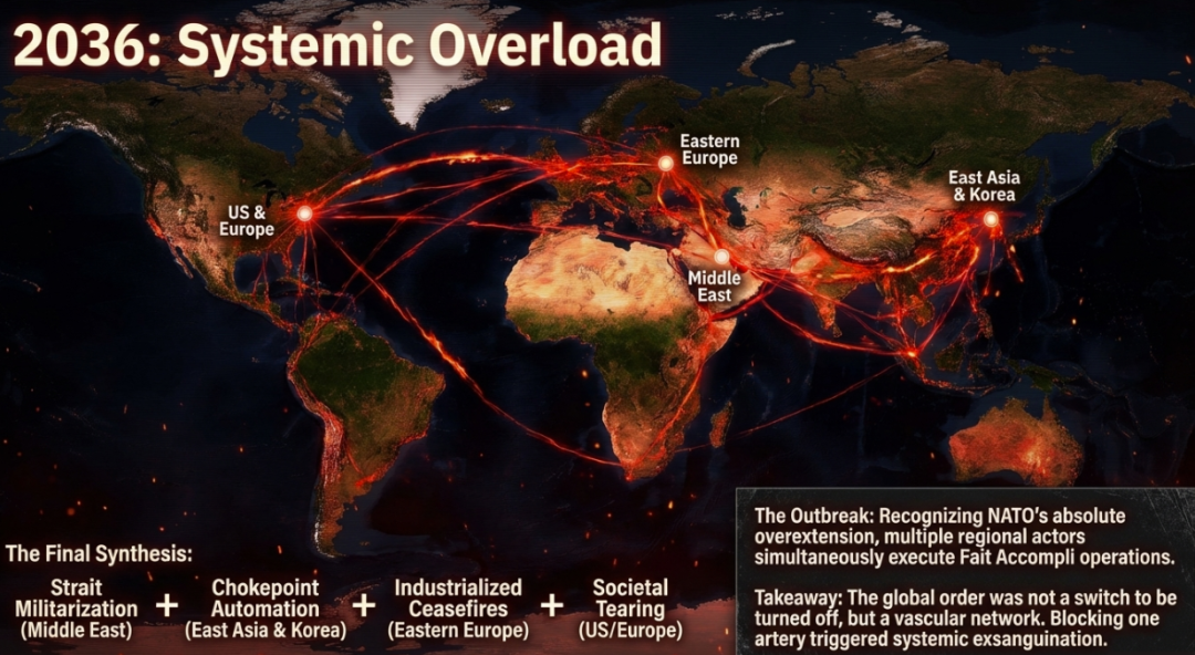 从2036年的角度看,2026年春天并不是一场战争的结束,也不是一场战争的开始,而是一个时代的转轴。美国想从世界退后一步,却没有意识到,全球秩序并不是可以随手关闭的装置。它更像一张彼此连通的血管网,任何一个咽喉被堵住,都会引发全身失血。中东的海峡化、东亚的咽喉化、半岛的武装自动化、东欧的军工厂化、欧洲的社会碎裂,再加上金融市场引导出的集体冷漠,最后都汇入同一条河流,也最终导致了3个月前,东亚、俄乌、中东的冲突全面、同时爆发。所有人都看到了实现意图的机会,也都确信NATO的分身乏术。