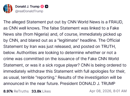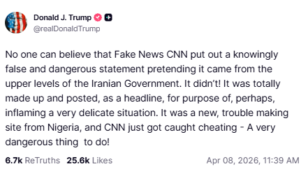 3. 特朗普连续发帖批判主流媒体,说“10点计划”是假新闻:特朗普对CNN和《纽约时报》等主流媒体关于伊朗“10点计划”的报道非常震怒。他在Truth Social上连发两帖,措辞强烈地痛斥这些报道纯属“假新闻”,是彻头彻尾的“欺诈行为”,称CNN在故意散布来自伊朗政府高层的虚假声明,该声明完全是捏造(注:声明完全属实),目的是在当前极为敏感的中东局势中煽风点火、制造混乱。他还表示“伊朗官方的真实声明”已经发布并张贴在他的Truth平台上(就是他本人转发的伊朗外长阿拉格奇的帖子,特朗普大概以为这是伊朗政府唯一的对外声明,而且阿拉格奇的帖子也明确提到了“10点计划”)。他表示有关部门正在调查此事,究竟是有人故意犯罪,还是某个“病态的流氓玩家”所为,并下令CNN立即撤回该虚假声明,同时做出全面道歉。