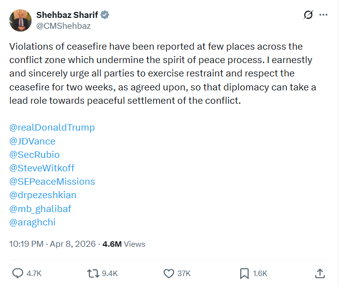 5. 调解人巴基斯坦指出:停火协议已遭到破坏。巴基斯坦总理谢里夫此前亲自宣布停火协议,明确表示协议“覆盖包括黎巴嫩在内的所有地区”。在以色列对黎巴嫩升级军事行动后,谢里夫发帖,确认停火协议已遭到违反。巴基斯坦外交部也发表正式声明,以最强烈措辞谴责以色列对黎巴嫩的持续军事侵略,称其导致数百平民死亡和近五十万人流离失所,严重违反国际法,破坏黎巴嫩主权与地区稳定。声明呼吁国际社会采取紧急行动,结束以色列的“无差别针对平民”和对黎巴嫩领土完整的侵犯。