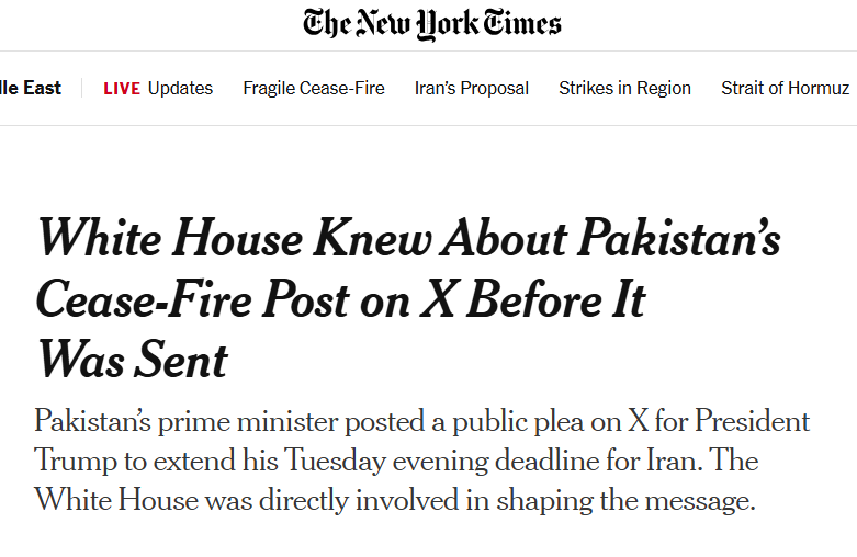 2. 巴基斯坦总理夏巴兹·谢里夫在宣布停火时,发布了一条事先拟好的内容。《纽约时报》报道,在发布之前,白宫审核并同意了内容。