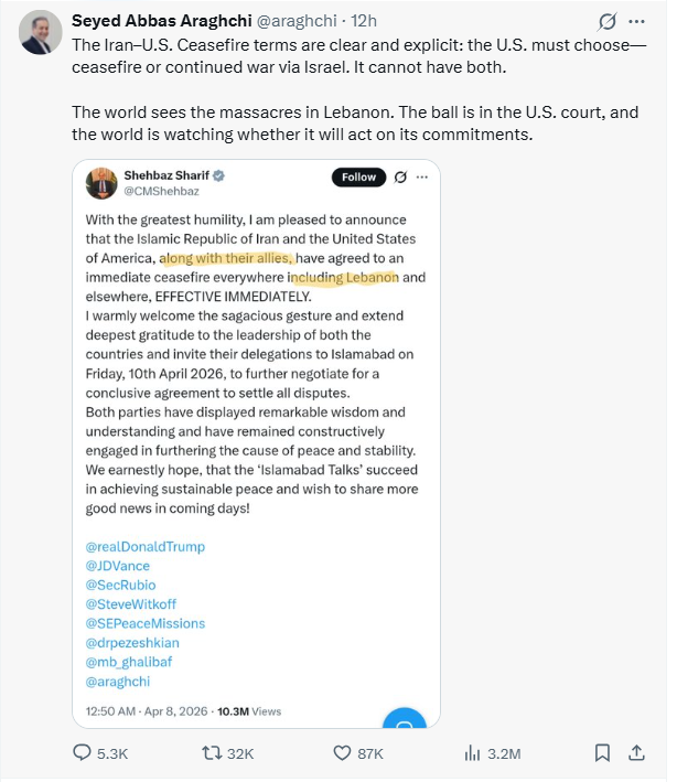 5. 伊朗外长阿拉格奇也在社交媒体上发帖宣布停火。他写到:“考虑到……美国总统宣布接受伊朗‘10点计划’的总体框架作为谈判基础”,则如果针对伊朗的攻击停止,伊朗也会停火。