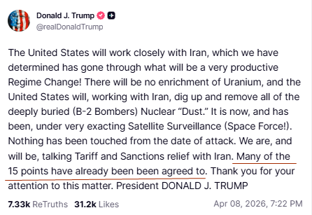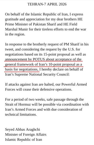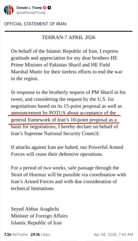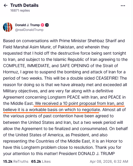 4. 特朗普发帖宣布2周停火,提到收到伊朗的“10点计划”,认为是可行的谈判基础