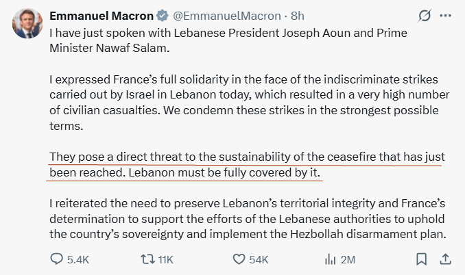 4. 法国等主要国家强烈反应。法国总统马克龙当晚发帖,严厉谴责以色列的“无差别打击”,称其造成“非常高的平民伤亡人数”。他表达了法国对黎巴嫩的“完全声援”,并强调这些袭击“对刚刚达成的停火协议的可持续性构成直接威胁”。马克龙明确要求,美伊停火协议必须“完全覆盖黎巴嫩”,不能将黎巴嫩排除在外。