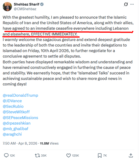 2)关于“黎巴嫩作为停火的一部分”:作为调停方的巴基斯坦,在第一个声明里就用白纸黑字明确说明了黎巴嫩是停火的一部分。