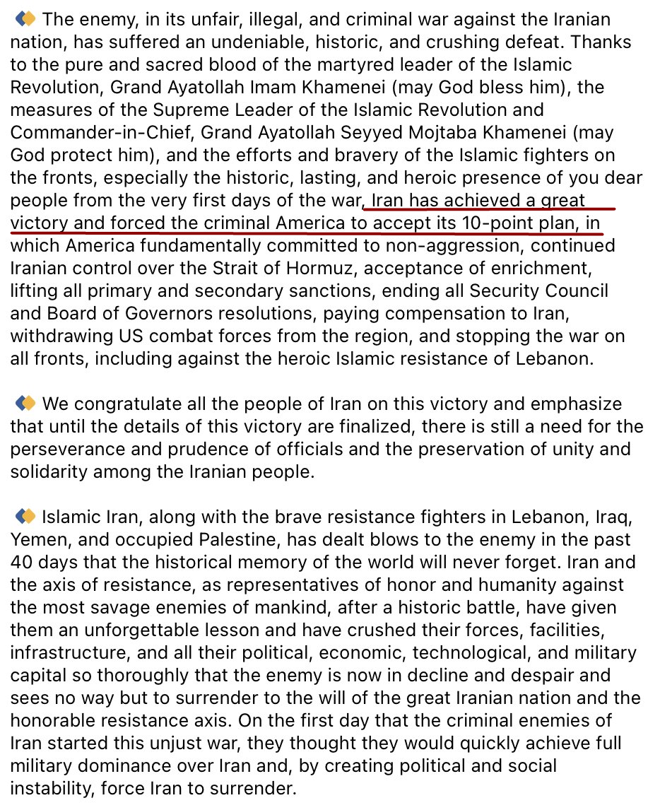 7. 伊朗最高国家安全委员会也发表了声明,特别提到10点计划:“伊朗取得了伟大的胜利,并迫使罪恶的美国接受了其(伊朗的)‘10点计划’。”