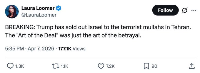 2)主战的右翼媒体,尤其是默多克旗下的福克斯新闻、《华尔街日报》、《纽约邮报》及其鹰派评论员(代表人物犹太裔的Mark Levin),还有众多一向强硬的反伊朗保守派、新保守派政客及意见领袖,则因为特朗普接受将伊朗“10点计划”作为谈判基础感到深深地震惊、困惑、怀疑、不安与失望。昨天应该是他们最难过的日子:既担心特朗普退缩,又不能接受按照“10点计划”谈判,同时也不愿公开批评特朗普,只是选择暂时观望。(下图为疯狂支持以色列、反伊斯兰的犹太裔右翼政治网红Laura Loomer的发帖,看到特朗普改变口径后自行删除:“特朗普为了德黑兰的恐怖分子毛拉出卖了以色列。‘交易的艺术’不过是背叛的艺术。”)