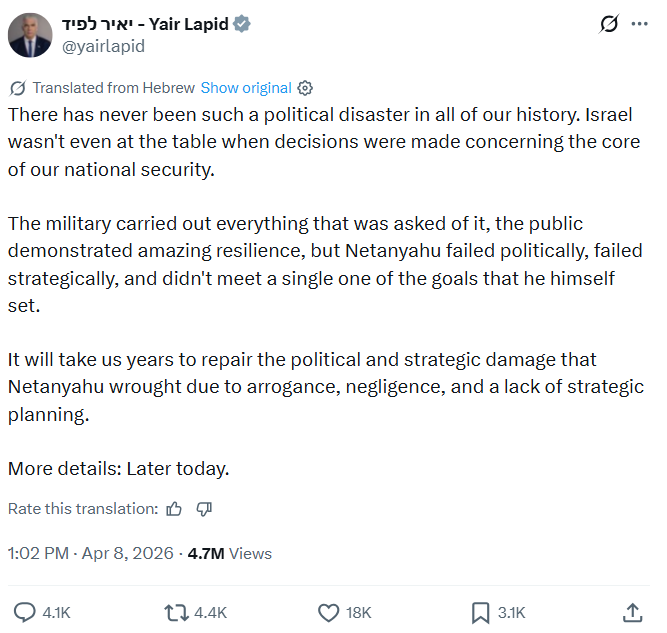 反对派领袖和部分执政联盟成员指责他没有将以色列的军事优势转化为战略胜利,让伊朗获得喘息机会,并在谈判中占据了更有利的位置。反对党领袖伊尔·拉皮德(Yair Lapid)的批评最为激烈。他在社交媒体上直言,这是“以色列历史上从未有过的最严重外交灾难”。“以色列甚至没有坐在谈判桌前,就让关乎国家核心安全的问题被他人决定”。他强调,军队完成了所有被要求的任务,民众展现了惊人的韧性,但内塔尼亚胡却在外交和战略上双双失败——他自己设定的战争目标一个都没有实现。反对派姑且如此,极右翼政客和评论员更是哀鸿遍野,对美伊停火极度不满和不安:认为原本以色列正在胜利,结果现在却要吞下失败。