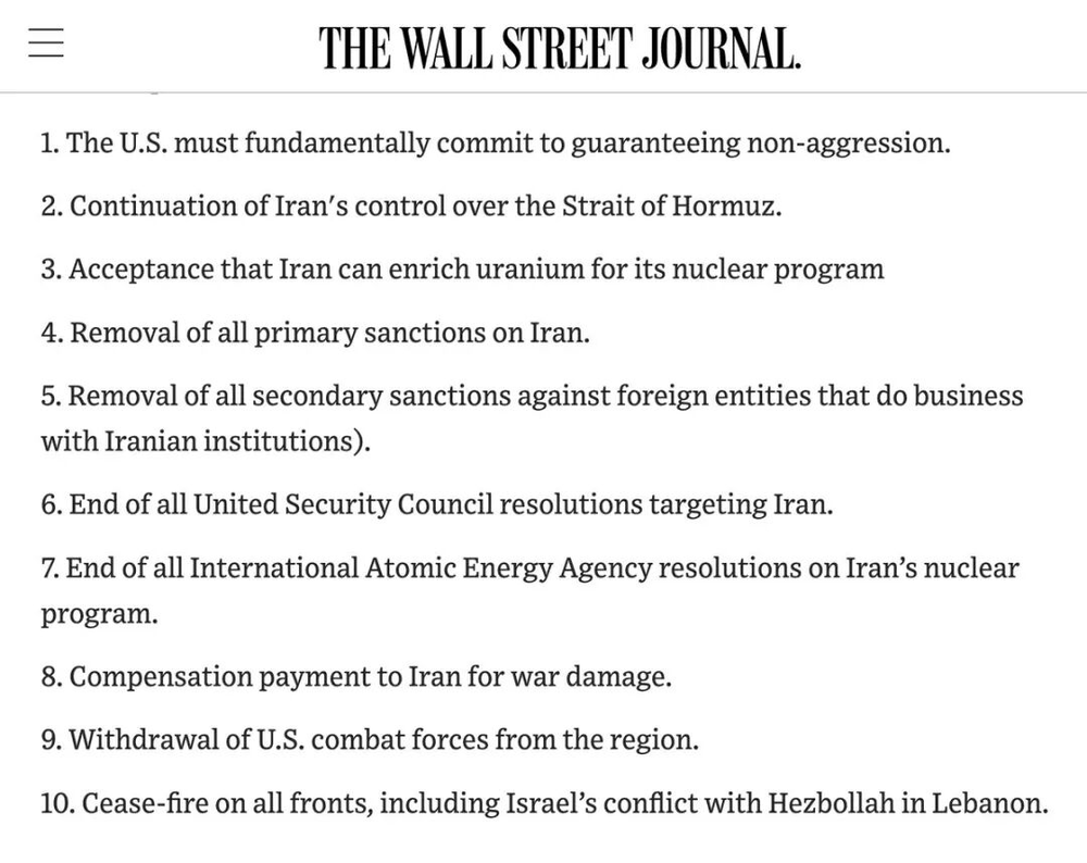 1)伊朗的“10点计划”,实质是要求美国和以色列投降;