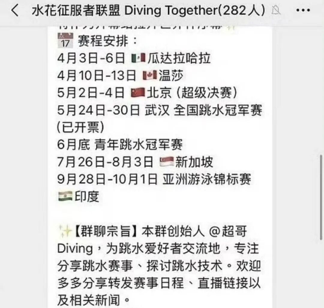 表面看,是一个跳水项目同好会,管理员会发布赛事信息与行业动态。