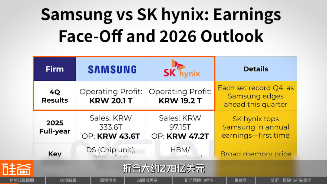2026年1月底,韩国存储双雄三星电子和SK海力士同时公布了上一年第四季度财报。数字有多夸张呢?两家公司合计营业利润接近40万亿韩元,折合大概278亿美元,相当于每天净赚3亿美元。在这样创下历史的利润下,SK海力士的年终奖,人均达到64万元人民币,刷新公司历史纪录。