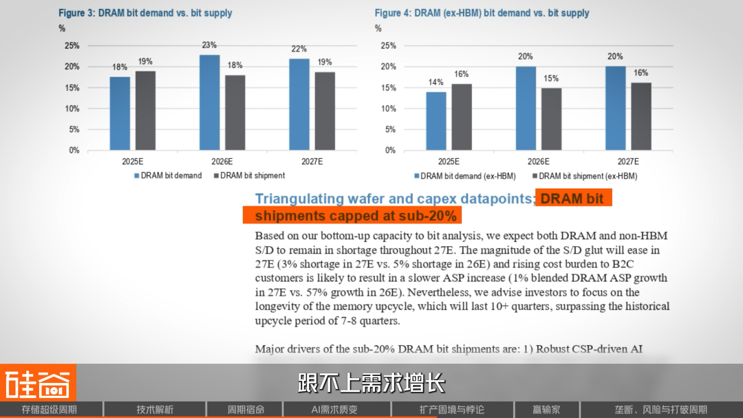 来自J.P.Morgan研报中的供需模型也得出了类似结论:DRAM的供给增长,在未来两年将被压制在20%以下,跟不上需求增长。