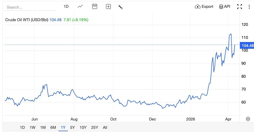 美国总体电价已经在上涨,13日WTI原油期货上涨了9.3%,每桶突破105美元。