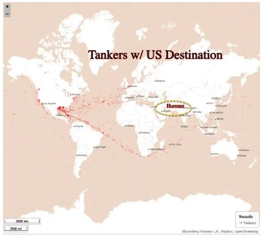彭博社通过自动识别系统传输的最新船舶跟踪数据显示,美国很有可能已经成为世界的紧急加油站。