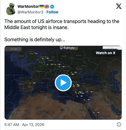 零对冲转引X上的OSINT(开源情报)账户报告称,12日晚些时候,美国空军货运机飞往中东。