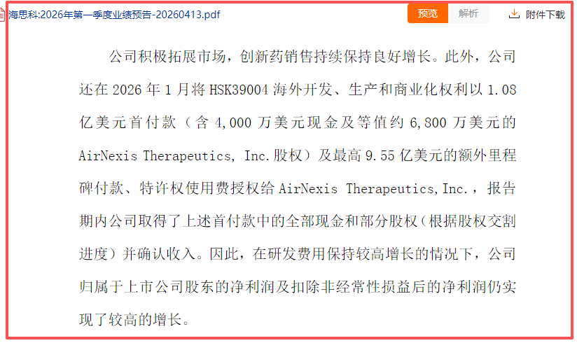 推动这份亮眼一季报的,不是核心产品放量,而是一笔对外授权(BD)交易的首付款确认。几乎同一时间,海思科宣布与艾伯维达成合作,HSK39004获得对外授权,交易总金额约50亿元。