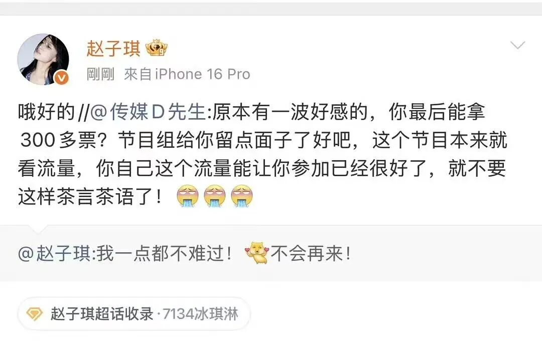赢了总分的人要承受淘汰,输了总分的人反而全员晋级,这套逻辑的荒诞感,让人想起选秀年代某些被骂上热搜的“做票”事件。现场观众直接喊出“黑幕”,孙怡在台上哭到说不出淘汰名单,王濛双臂抱胸拒绝起立鼓掌,赵子琪赛后发文:“我一点都不难过!不会再来!”