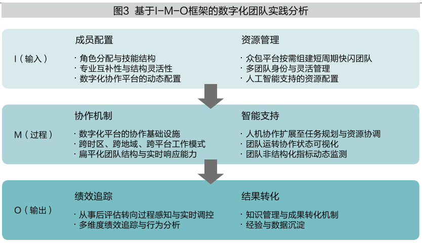 无边界、多团队身份、流动性、虚拟性与人机协作五大特征共同构建了数字化团队独具优势的运作机制。在此基础上,为进一步揭示数字化团队的运作逻辑与管理实践路径,我们采用I-M-O(Input-Mediator-Outcome)框架,从团队输入、中间过程与团队结果三个方面展开系统分析,揭示数字化团队的管理创新实践。