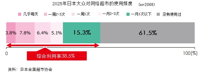 与国内形成鲜明对比的是日本市场。2025年日本全国超市协会调查数据显示,日本大众网络超市综合利用率仅38.5%,61.5%的人群几乎不使用网络超市。其中,40至59岁女性群体使用率仅68.9%,网购更多作为实体购物的补充。