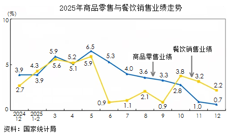 从零售行业核心指标来看,商品零售与餐饮销售两大板块同步承压。餐饮业在2025年6至9月面临较大经营压力,四季度虽有小幅回暖,但整体走势依然向下;商品零售活力从2025年6月开始持续走低,四季度下滑压力甚至超过餐饮行业。其中,服装服饰、家居家具等品类是商品零售下滑的主要代表,商务餐、高档烟酒则成为拖累餐饮业绩的核心项目。