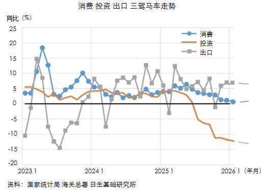 在消费、投资、出口三驾马车中,2025年出现最显著变化的是投资指标,上半年大幅跌落,增速从5%左右降至2026年初的-10%以上。出口指标同样波动下行,四季度依托特定市场实现高速增长,拉动整体数据回升。最能反映民生状态的消费指标,在2025年呈下探趋势。