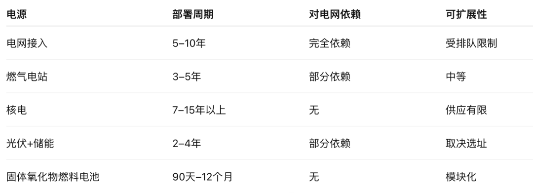 新建输电线路需要5至10年,燃气电站需要3至5年,核电(包括小型模块化反应堆)更是动辄数十年。然而,固体氧化物燃料电池的部署周期最快只要90天,实际上Bloom Energy只花了55天就完成为甲骨文数据中心供电的部署。