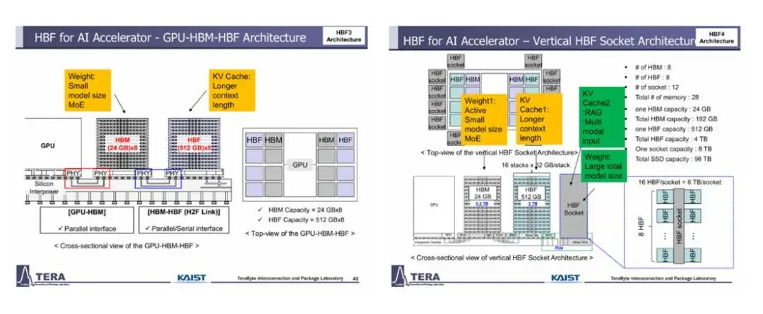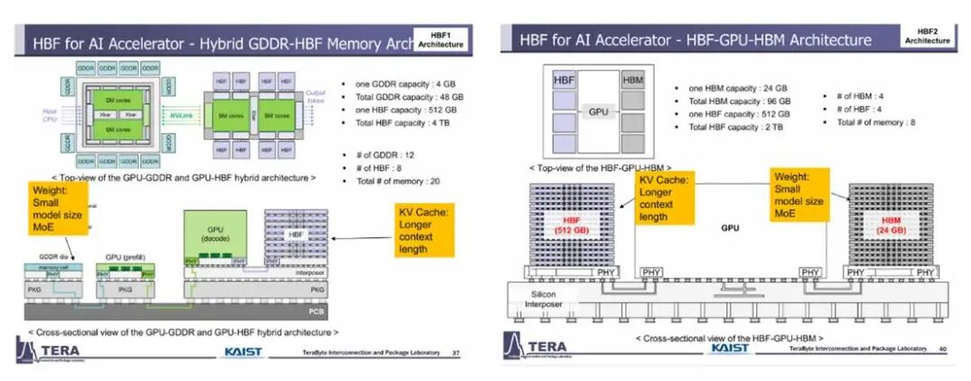 第一种架构(下图的HBF1 Architecture,以下略称为HBF1等),本质上是将Transformer的编码与解码在硬件上解耦。前者由一颗轻量GPU负责,依赖GDDR即可完成计算,后者则由另一颗GPU主导,并配备大容量HBF。HBM被完全抛弃了,以较低成本实现对长上下文、多模态输出场景的支持。第二种架构(HBF2)则是在同一GPU两侧同时部署HBM与HBF,其中,HBM主要服务于模型权重与高带宽计算,而HBF则承载规模迅速膨胀的KV缓存与长上下文状态。这能兼顾模型规模与成本。