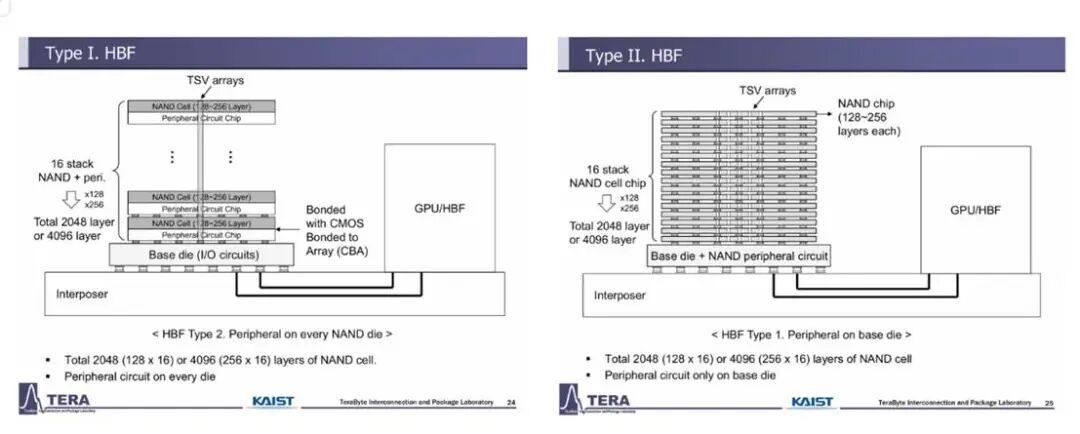 在早期阶段,在单颗已经具备百层结构的NAND裸片(die)之上,继续进行芯片级堆叠,将多个die叠加至十余层,从而把存储密度从“百层”放大到“数千层”;长远来看,控制与外围电路被整体迁移至基础裸片(base die),上层只保留纯粹的存储单元,使堆叠从“堆芯片”演进为“堆单元”,层数由此迈向“万级”。在这个过程中,通过引入TSV等在HBM领域已经相当成熟的垂直互连技术,补齐带宽,HBF才真正从“超大容量存储”,变成既能“装得下”,也能“读得出”的AI内存。