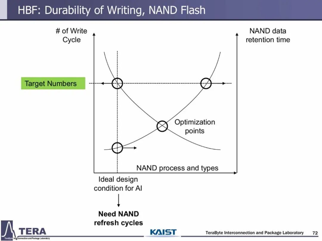 与此同时,HBF从“冷存储”走向“可参与计算的数据层”,其最大的技术挑战之一,是改写NAND的写入寿命曲线。NAND的“写入次数”与“数据保留时间”此消彼长。在传统NAND的设计中,为了长期保存数据,牺牲写入耐久。而HBF必须结合推理与训练的实际需求,主动适度缩短数据保留时间,以换取写入耐久与访问频率的数量级的提升。只有从当前约10万次,提升至100万甚至1000万次,才具备现实意义。