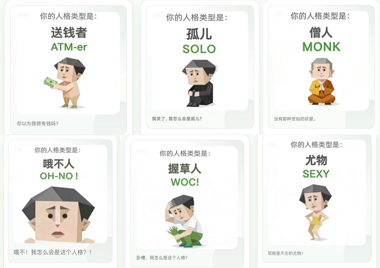 它由网友自制,题目不过几十道,输出结果却带着鲜明的“自黑”气质——“ATM-er(送钱者)”、“DEAD(死者)”、“JOKER(小丑)”。