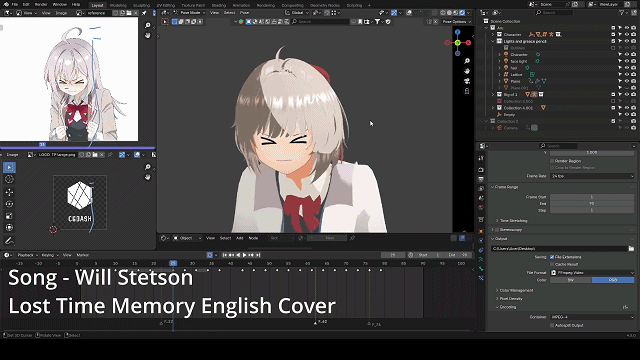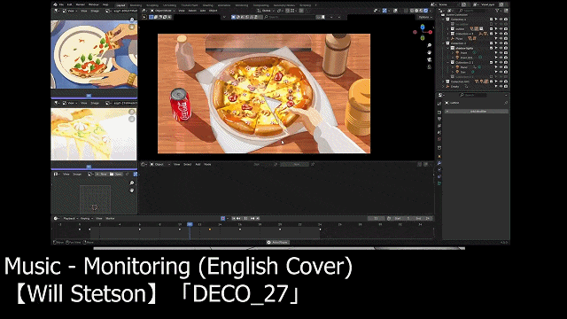 作者展示了最终成片和WIP的对比,通过调整摄像机参数和控制模型变形的Shape Keys,让3D模型呈现出了2D动画特有的扁平化和手绘感。