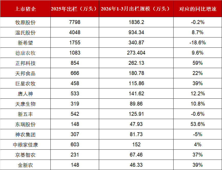 从2026年1—3月的出栏表现看,正邦科技、天邦食品、巨星农牧、东瑞股份、京基智农和金新农的出栏同比增速居前,短期成长性相对突出。