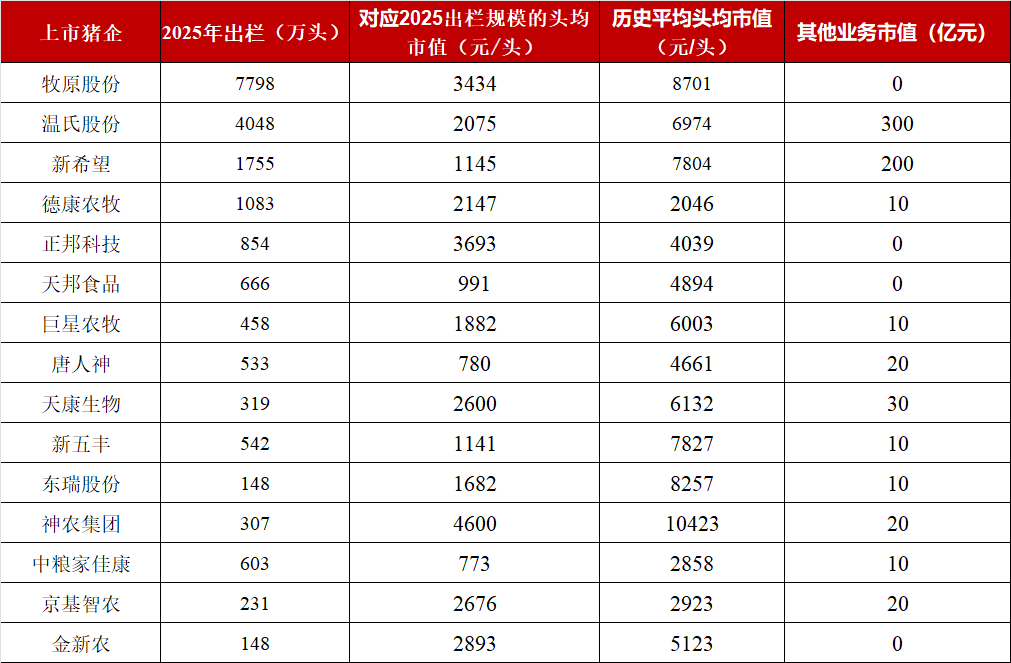 由于多数猪企并未披露2026年的出栏目标,我们统一采用2025年的出栏规模进行测算它们当前的头均市值,以供大家参考。