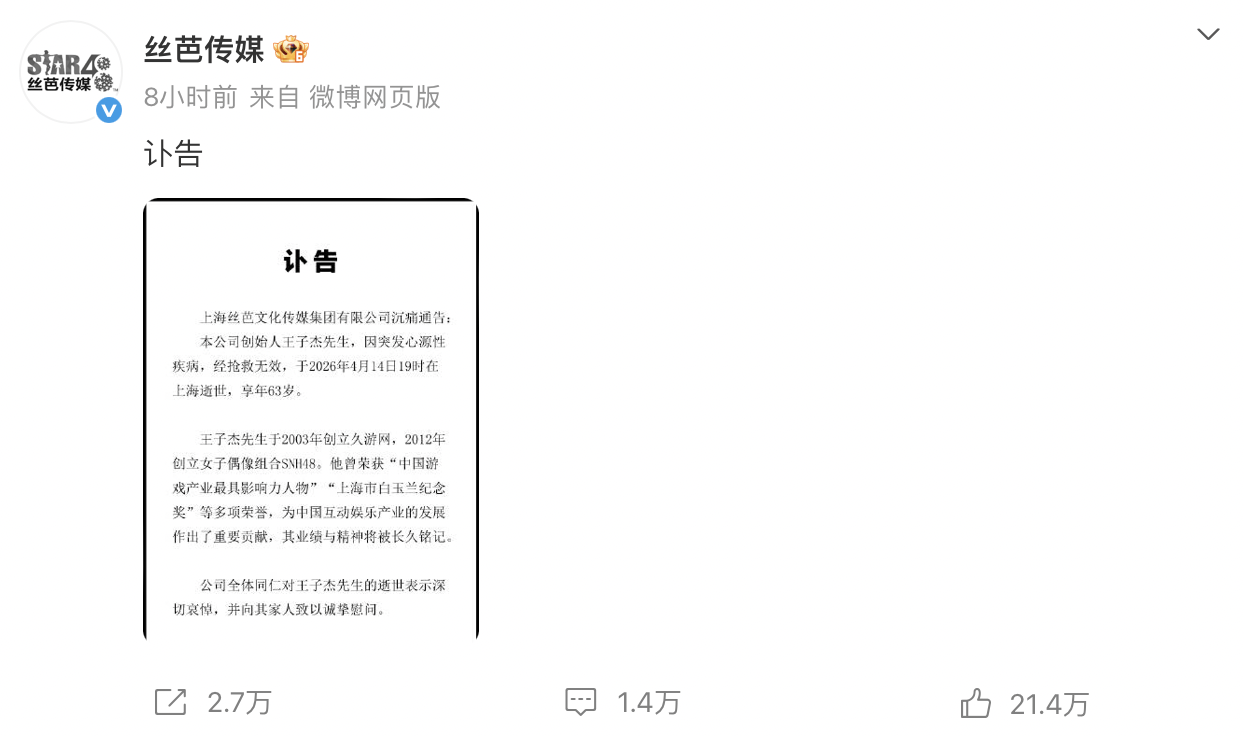 2026年4月14日,上海丝芭文化传媒集团创始人王子杰因心源性疾病突发逝世,享年63岁。丝芭传媒在4月16日发布的讣告中确认了这一消息。