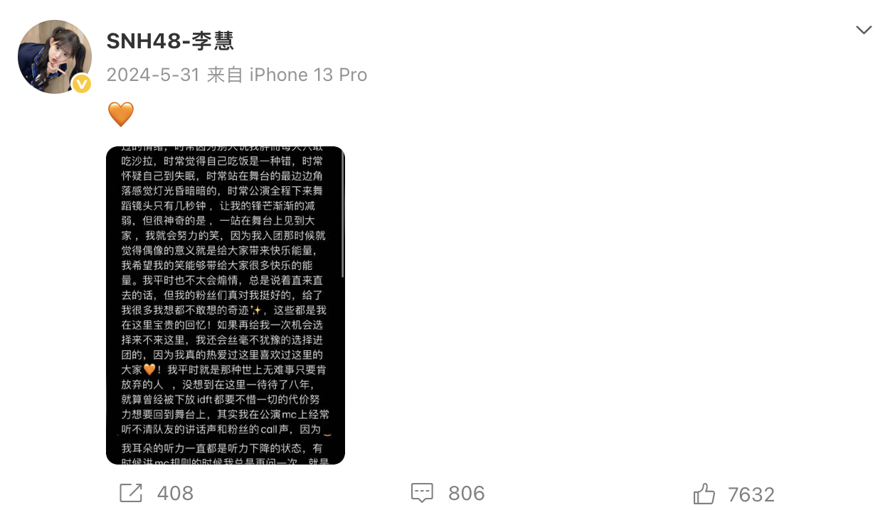SNH48前成员李慧宣布退团(图源:微博)