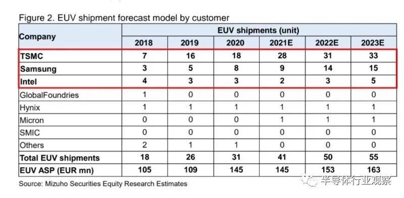 显然,先进制程芯片龙头台积电对EUV光刻机的需求量最大,可以与英特尔做一下比较,到2023年,预计台积电共拥有133台EUV光刻机,而英特尔为20台。