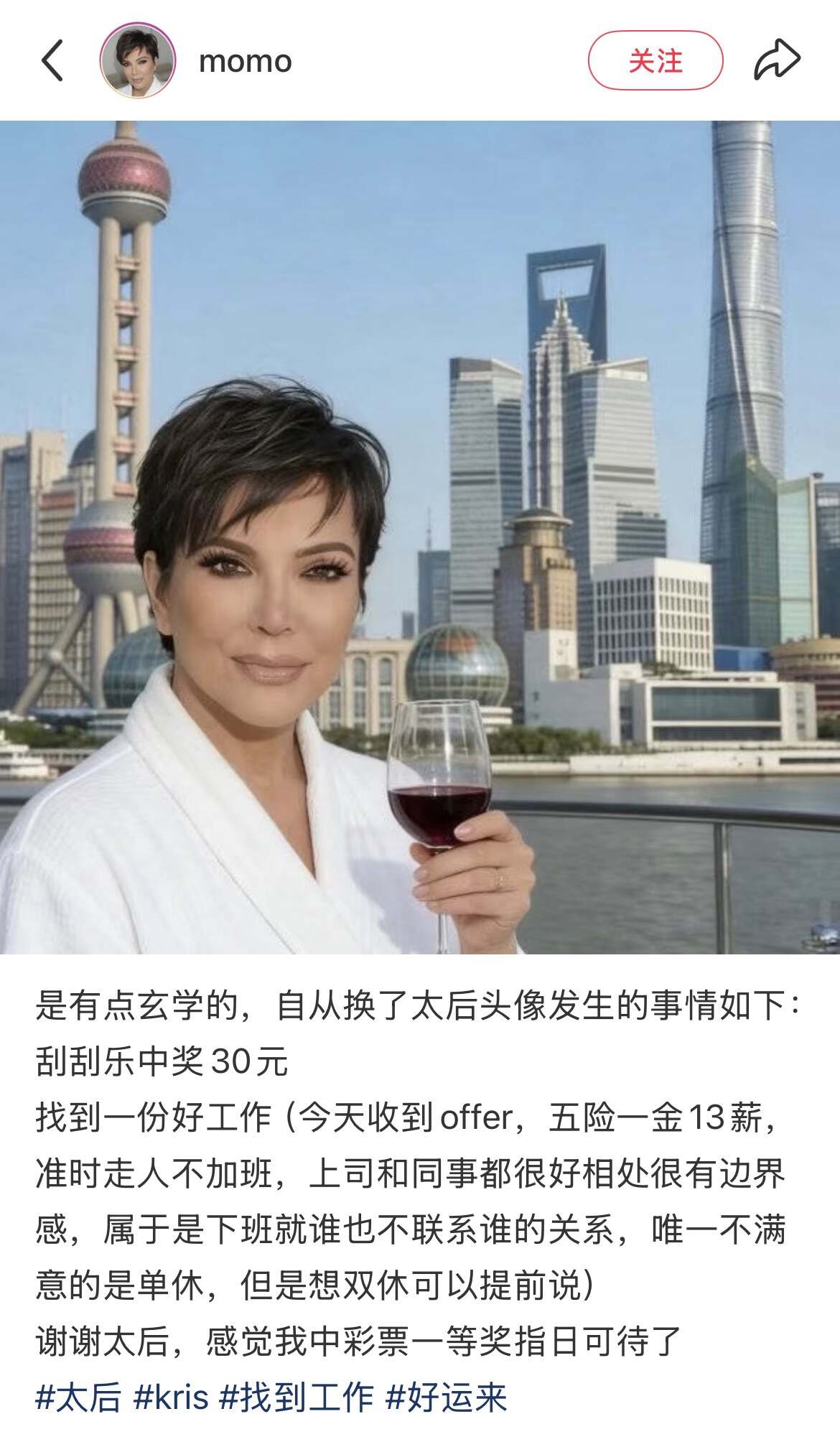 有网友现身说法,自从换上了太后头像,竟然真的找到了一份五险一金的工作,还顺便中了一张彩票;有网友表示自己换完头像之后立刻考试通过;有网友挂着卡戴珊头像晒出自己的录取offer。