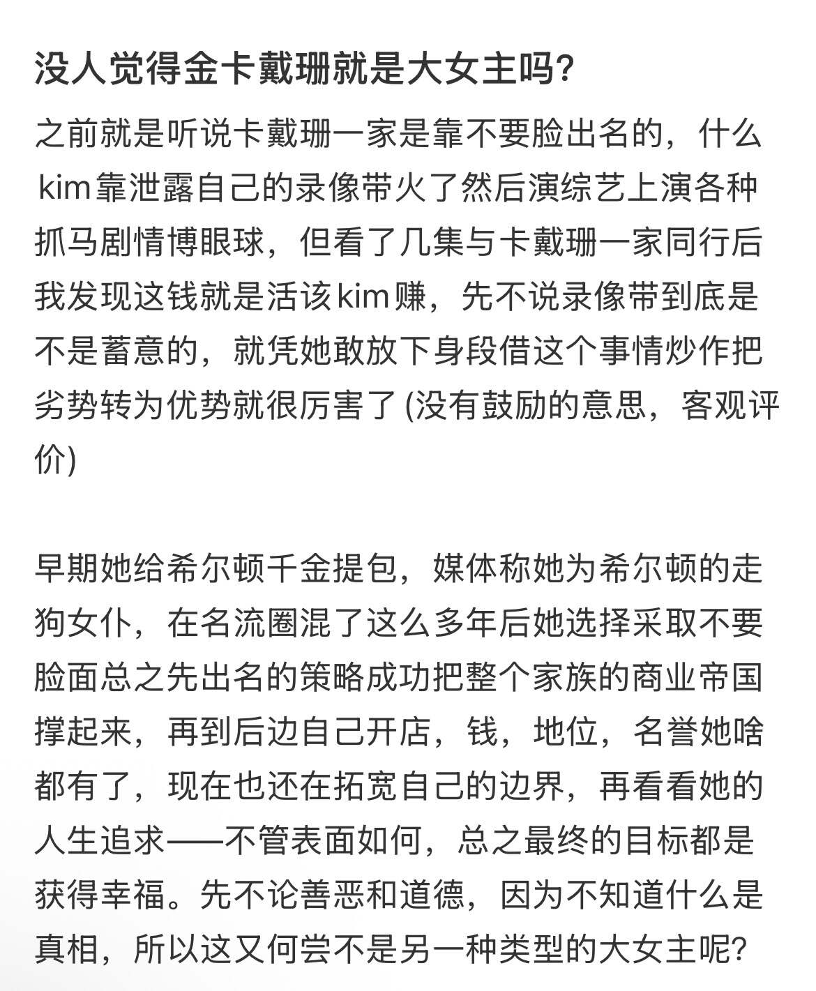 小红书上搜索关于卡戴珊的内容,基本上都是正面的女性力量内容。卡戴珊家族在某种角度上变成了当代的武则天平替、母系氏族的真正践行者、女性逆袭系列的主理人。