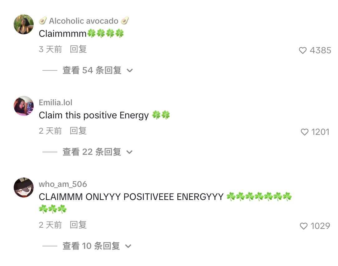 更有意思的是,在评论区里面齐刷刷地全是一个词:claim。这个词的意思其实就是中文里的“接接接”。东西方年轻人在某个层面上达成了一种不约而同的默契。