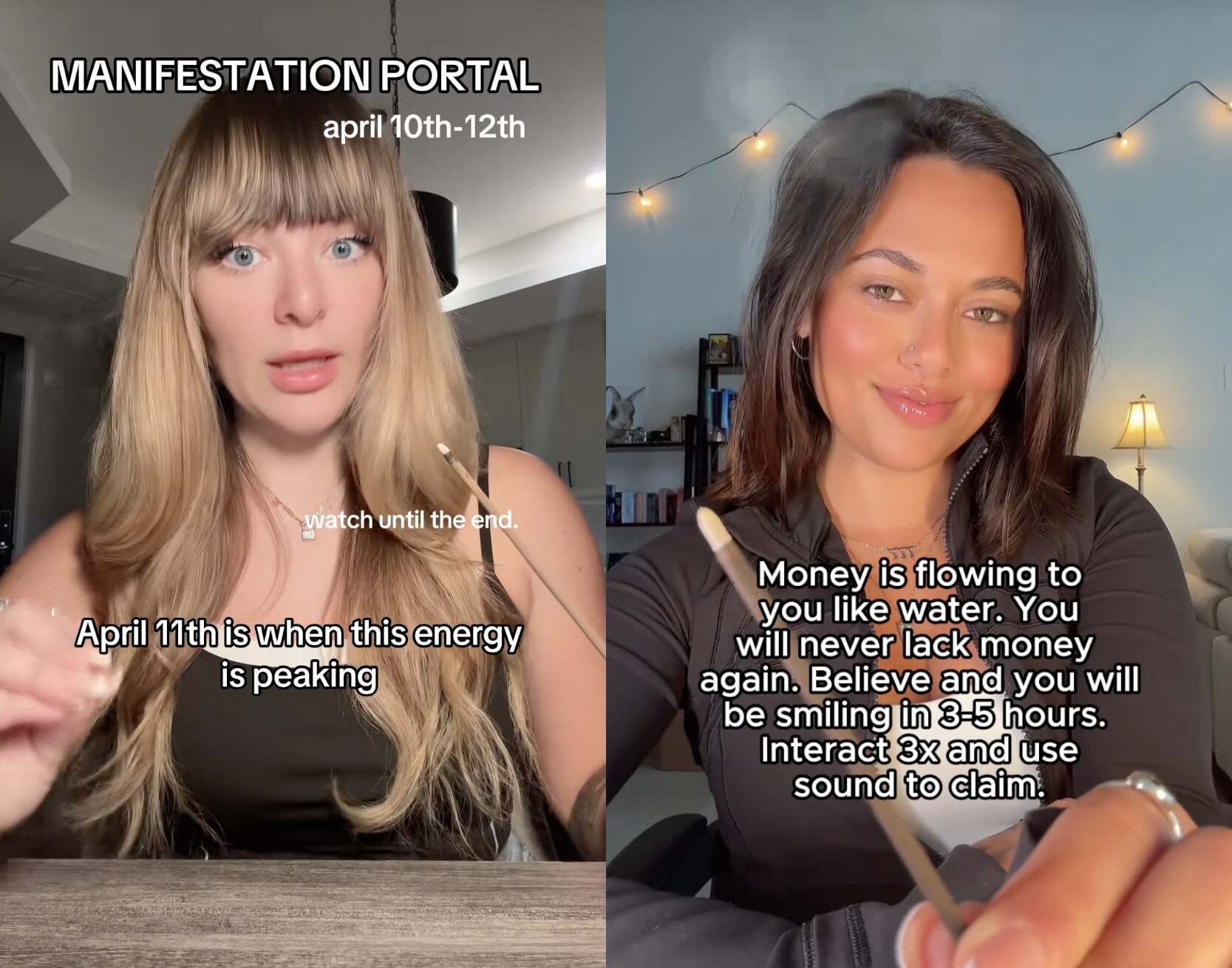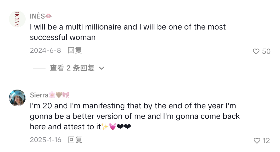 在TikTok上也有许多显化赛道的博主,她们要么分享自己的显化心得,要么为自己的视频附魔,点开收听一百遍就有奇效——和B站的显化视频差不多。