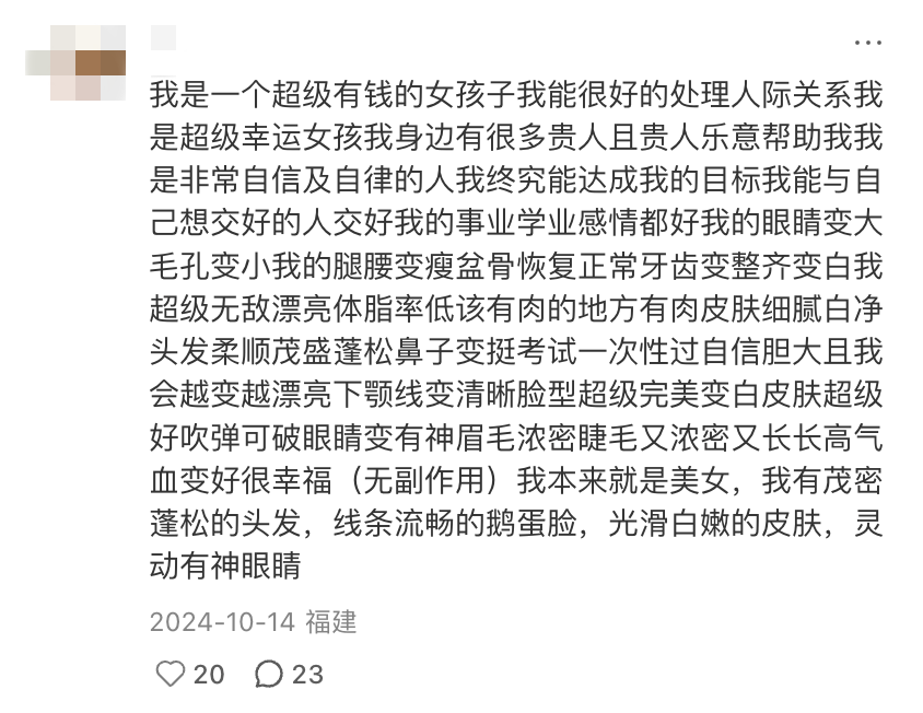 放一张刘亦菲或者张柏芝的照片,然后显化她的美貌也会出现在自己脸上——跟圈外人说,他们或许只会说一句“你想得可真美啊”。