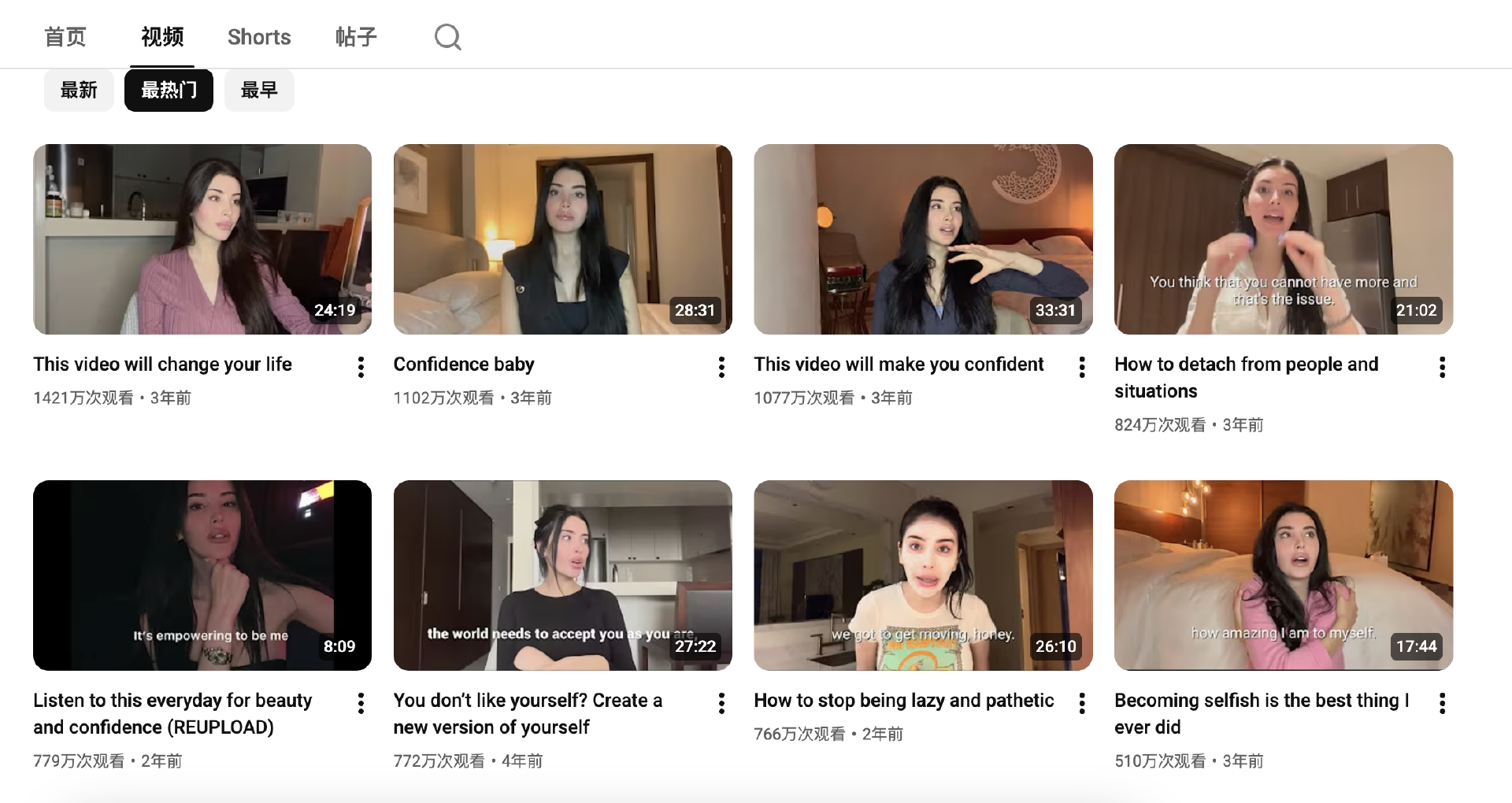 她的作品《这则视频将会改变你的人生》《这则视频将会让你变得自信》《学会自私是人生的必修课》《每天来听一遍显化你的财富和美貌》播放量均在千万级别。