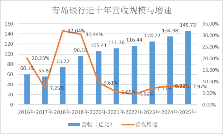 2025年,青岛银行营收145.73亿元,同比增加7.97%;归母净利润51.88亿元,同比增加21.66%。这样的增速跟科技行业没法比,但在经营压力大的银行业,属于领先的存在了。