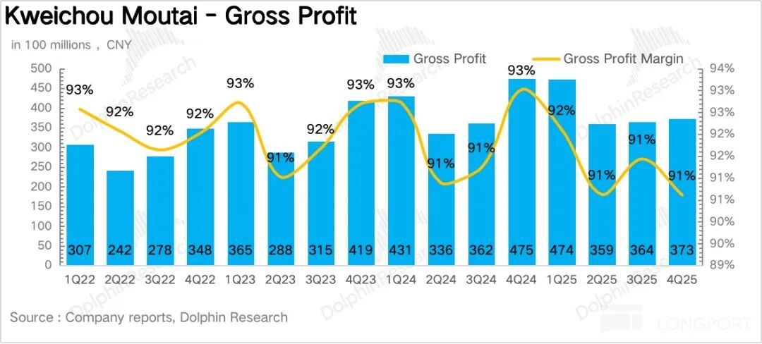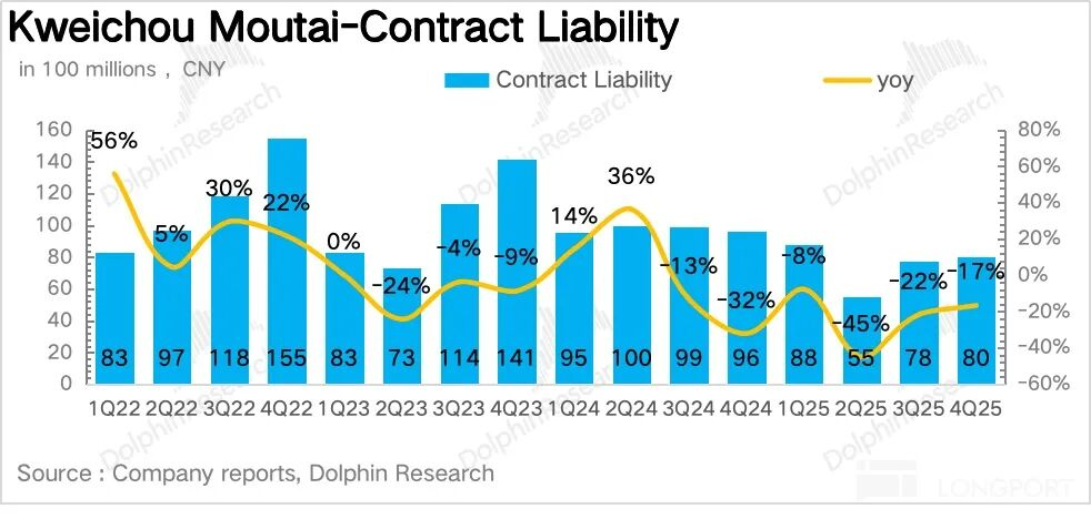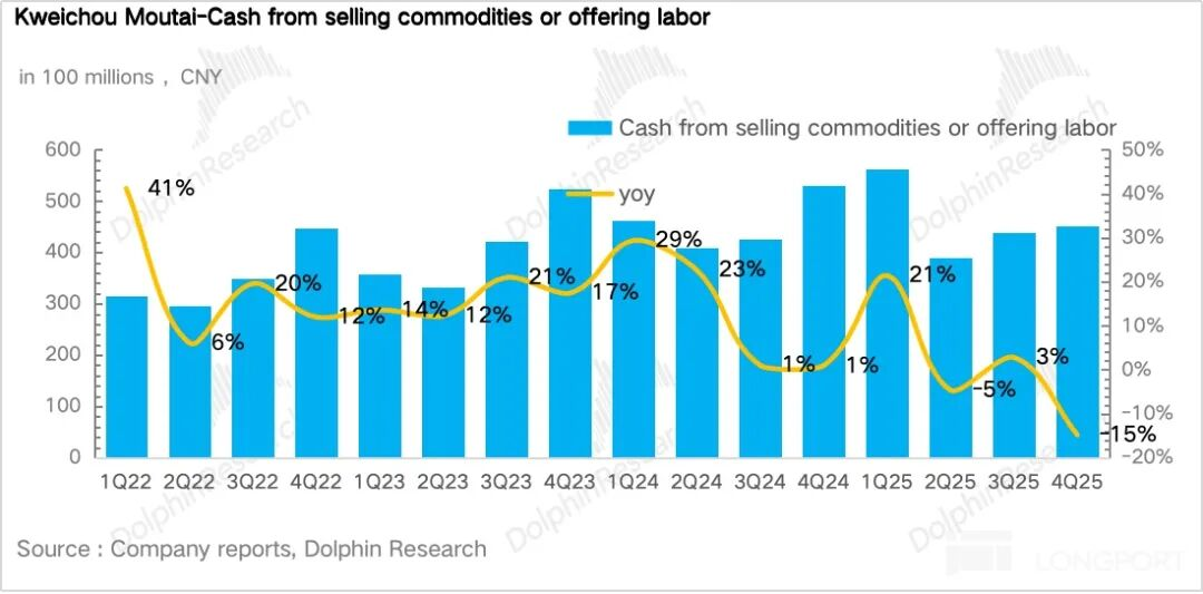 过去数年,茅台一般都是通过向经销商压货、提前确认收入来"调节"报表节奏。但2025年公司主动放慢了发货节奏,尤其是Q3(+0.3%)和Q4(约-0.6%),报表端的数据几乎等同于实际终端动销。这也意味着2025年的业绩基数是"干净"的,不存在透支未来的问题。