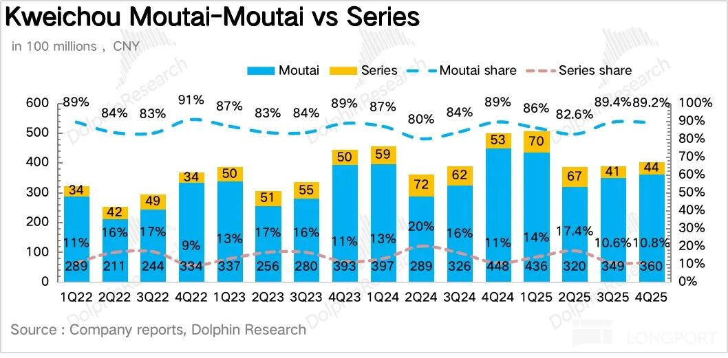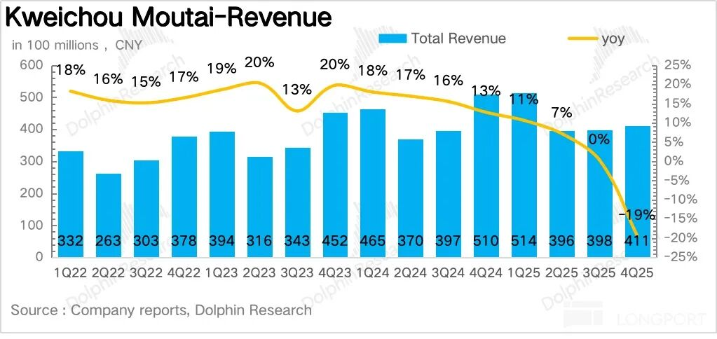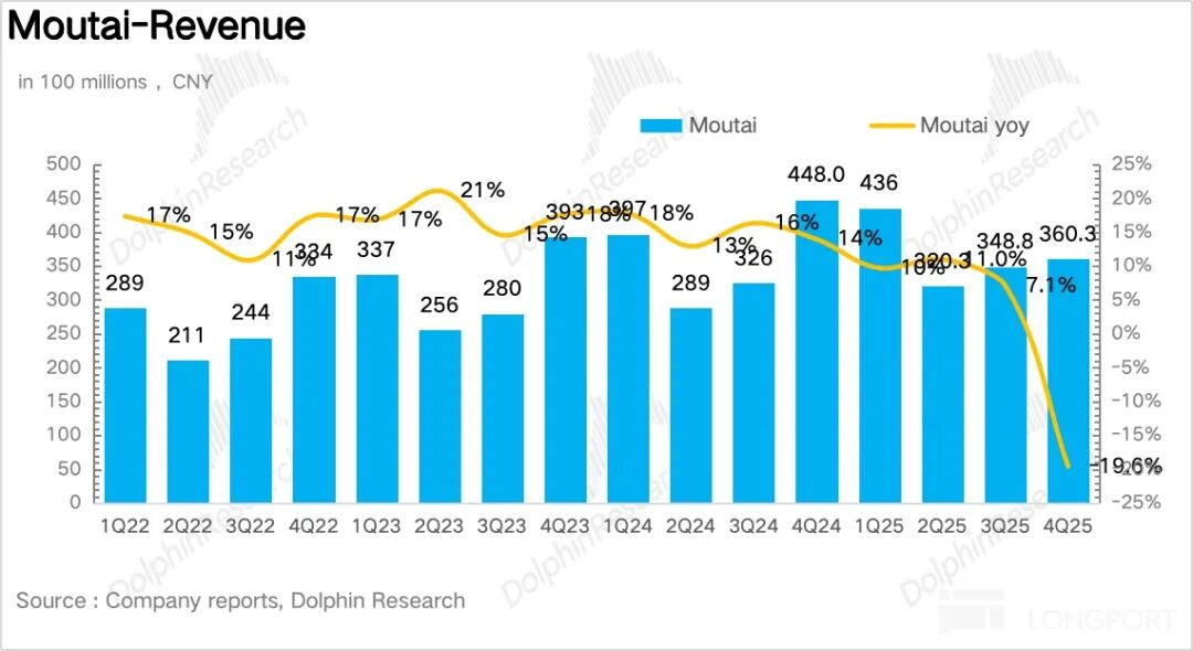 4Q25茅台酒实现营收360亿元,同比下降20%,全年维度下降10%。